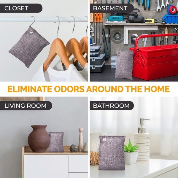 - 10 CHARCOAL DEODORIZER BAGS WITH HOOKS. Our 3.5oz bamboo charcoal bag musty smell eliminators are the perfect size to place wherever you have a bad smell: closet, car, shoes, gym bag, basement, pet areas.