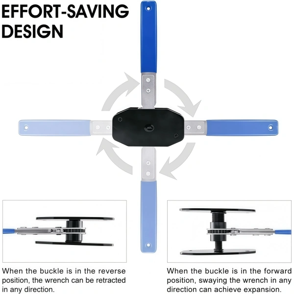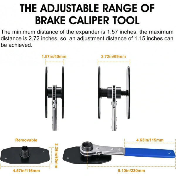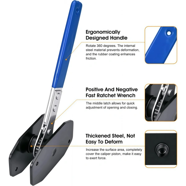 Central ratchet switch toggles compression/expansion, evenly spreads force to prevent piston misalignment for easy pad replacement