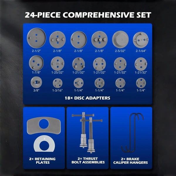 - 18x Piston Adapters,2x Thrust Bolt Assemblies,2x Retainer Plates,2x Brake Caliper Hangers,1x Pair of Work Gloves, 1x Storage Case, 1x Instructions