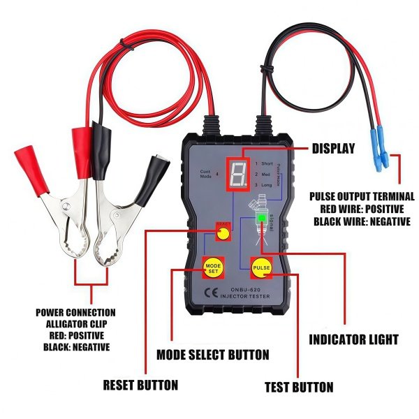 Car engine maintenance kit fuel injector tester uses 12V power and 4 pulse modes to diagnose clogged, stuck, or leaking gasoline injectors.
