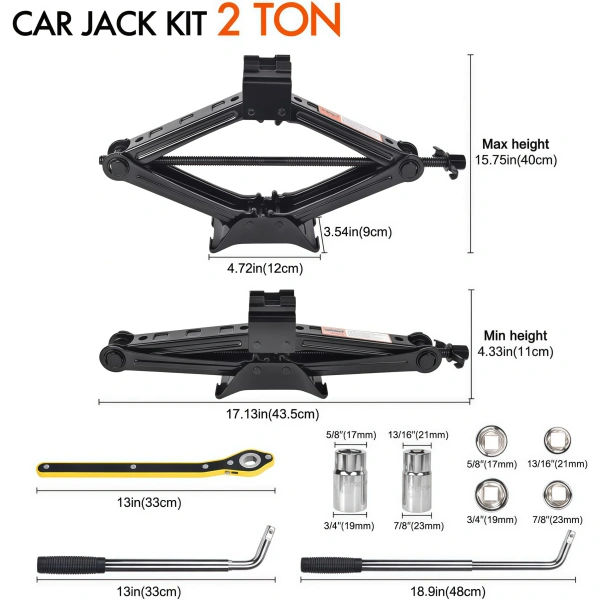 Maximum Lifting Weight 2 Ton (4409 Lbs),Lifting Range From 4.33″ (11cm) to 15.75″(40cm).This car jack kit is universally compatible with cars, SUVs and other vehicles.