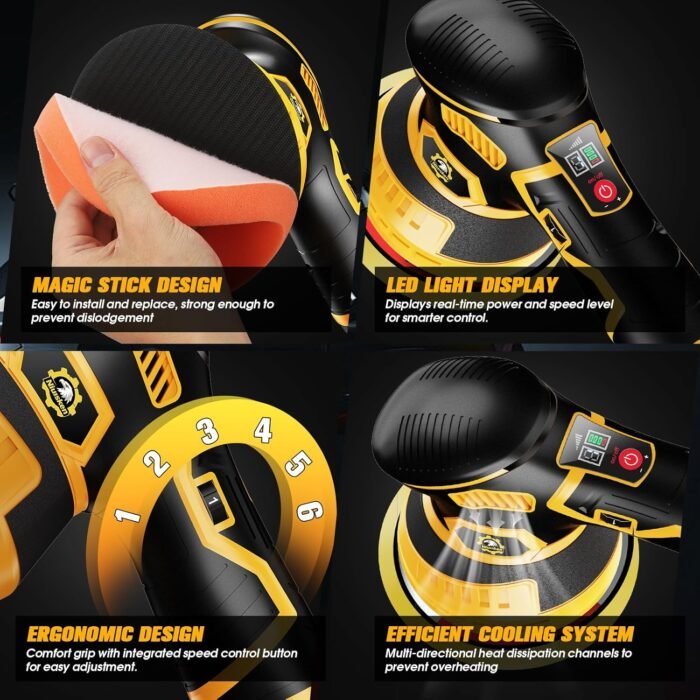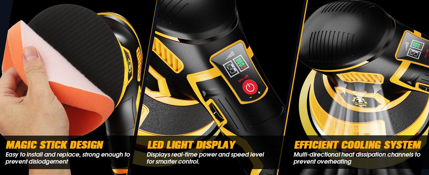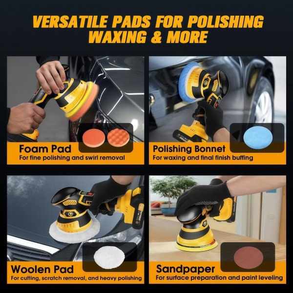 【Complete Accessory Kit for Multi-Surface Use】 Includes 3 flat Sponge pads, 3 wave Sponge pads, 2 wool pads, 2 microfiber bonnets, 2 non-woven bonnets, and 6 sanding discs—ideal for any car buffers and polishers kit. This polisher for car detailing also works on boats, furniture, metal surfaces, wood, flooring, marble, and ceramics—making it a versatile buffer for all your detailing needs. |