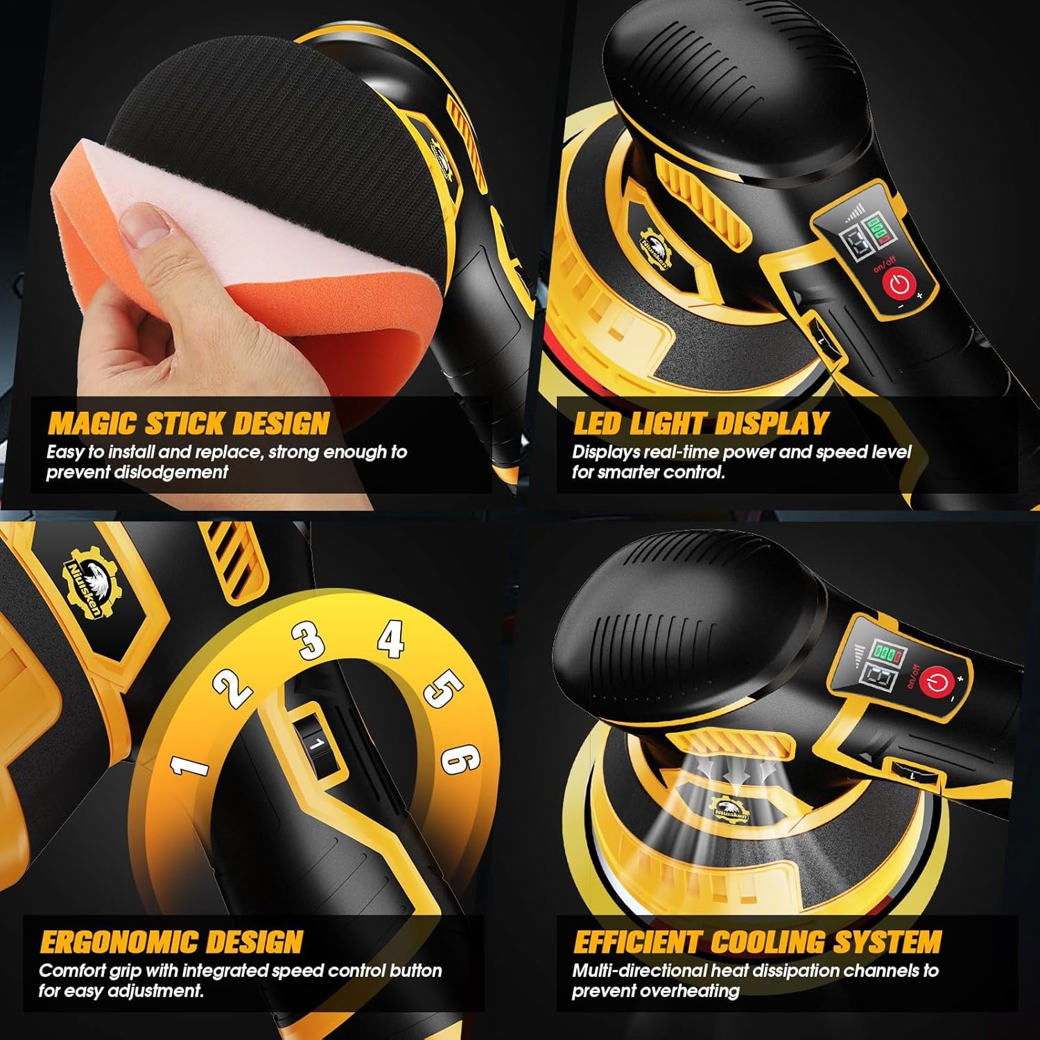 Car polishing kit features a cordless 6-speed random orbital buffer with an LED display and dual 21V batteries for swirl-free waxing, polishing, and scratch removal.