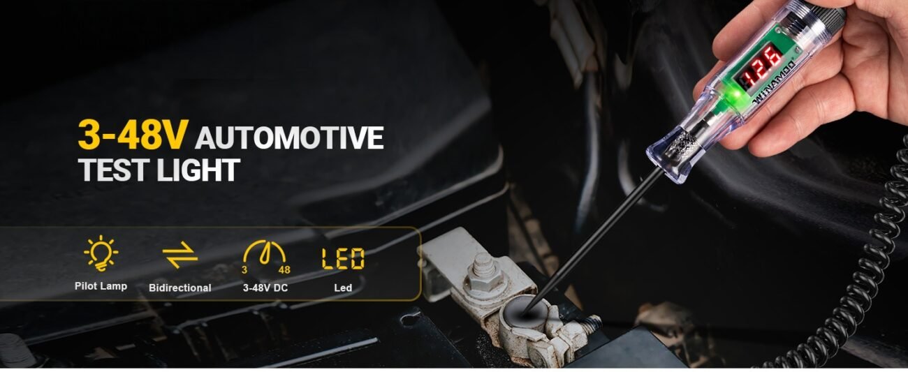Circuit tester pen delivers a clear LED readout with 0.1V resolution to test 3–48V automotive circuits and battery voltage fast.