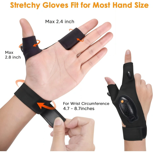 HANPURE flashlight gloves are designed to be one size fits most and have a longer wrist strap to help adjust the gloves to the perfect size.