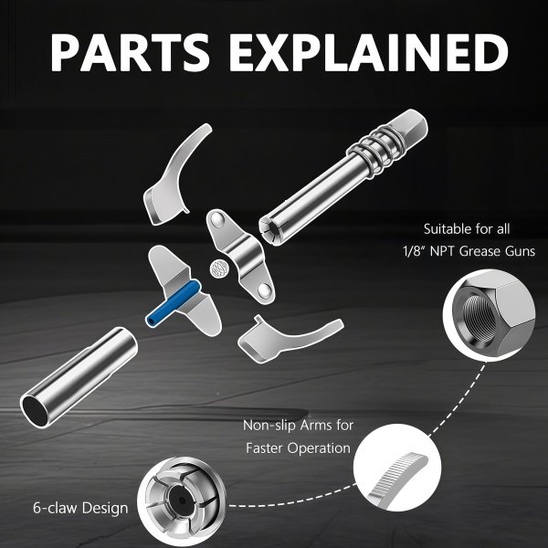 - All-in-One Grease Gun Accessory Kit: Includes 1pcs greases gun couplers, 2pcs precision needle grease gun tips, 1pcs quick-release grease coupler, 1pcs 12-inch flexible grease gun hose, 6pcs hydraulic grease fittings, and a rubber adapter—perfect for professional lubrication maintenance of automotive and industrial equipment.