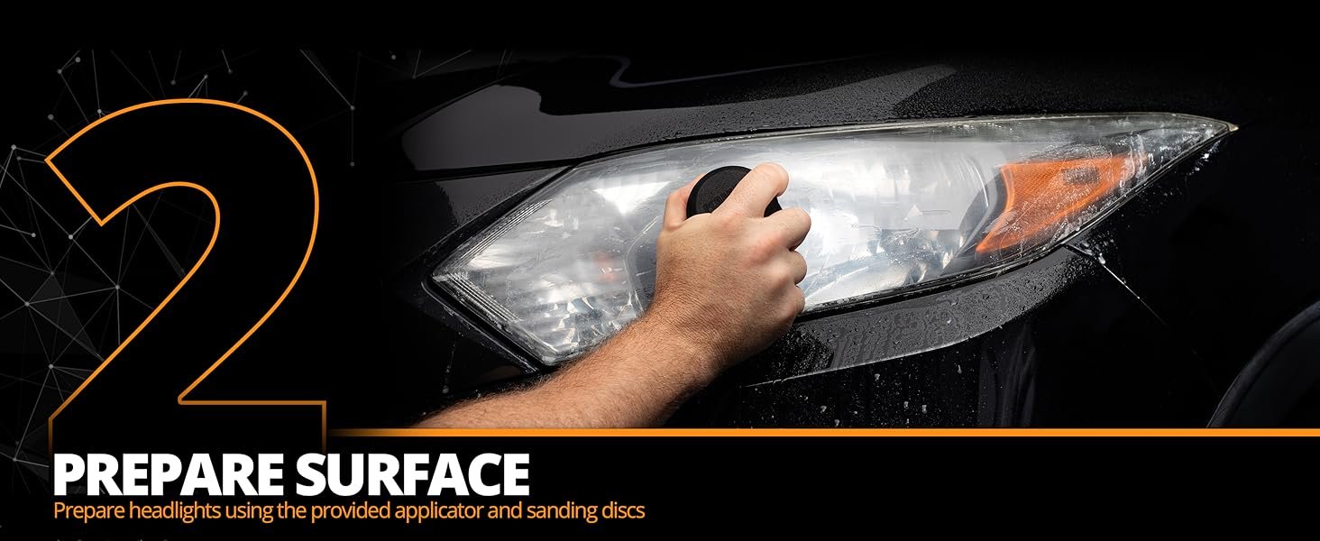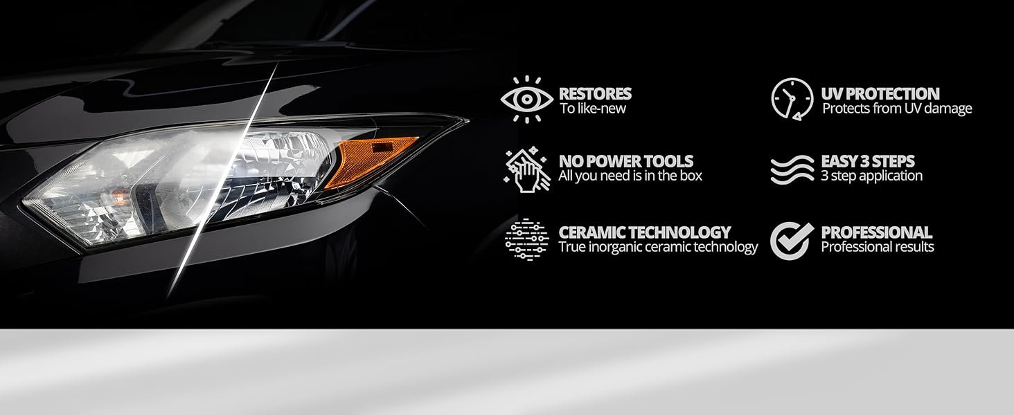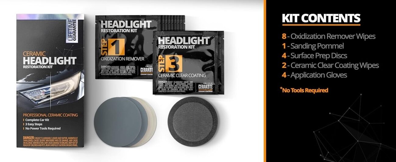 - Headlight repair kit restores cloudy headlights in 3 easy steps using oxidation wipes, sanding, and a ceramic UV-protective coating.