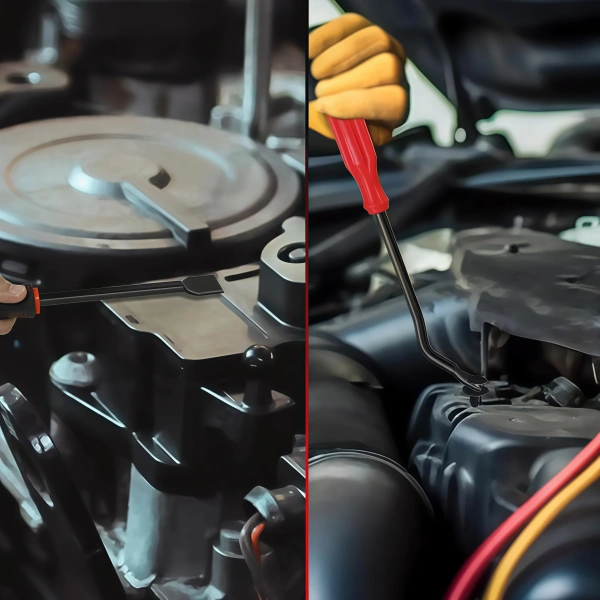 Pick and hook tool set includes large and small hook picks, a scraper, a clip removal tool, and a telescoping magnetic pickup tool for fast auto repairs.