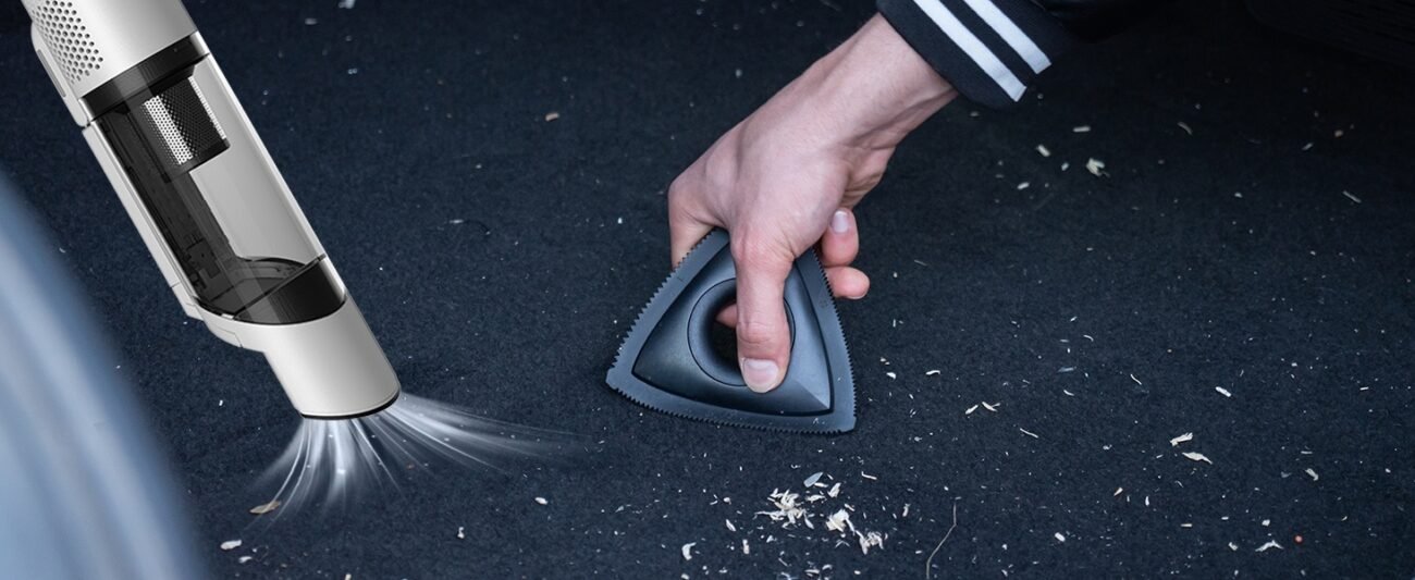 Mini pet hair remover for car detailing products; carpet hair remover for car interiors; triangular hair remover for car detailing, sofas, furniture, plush toys, and carpets (solid black).