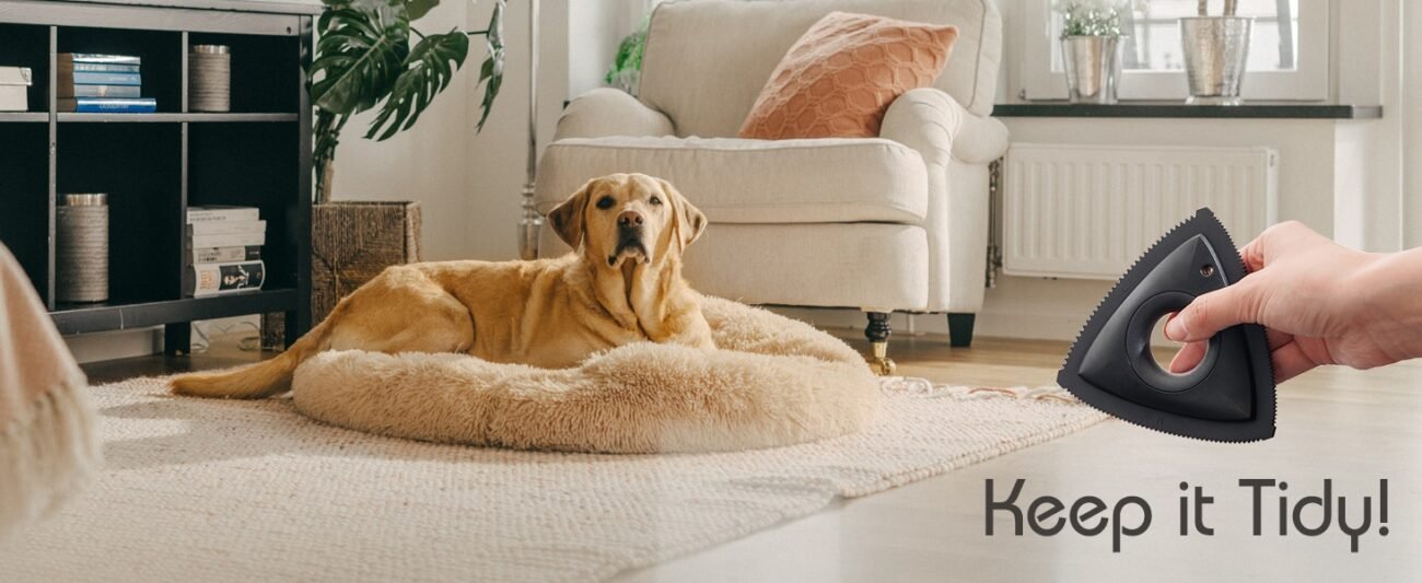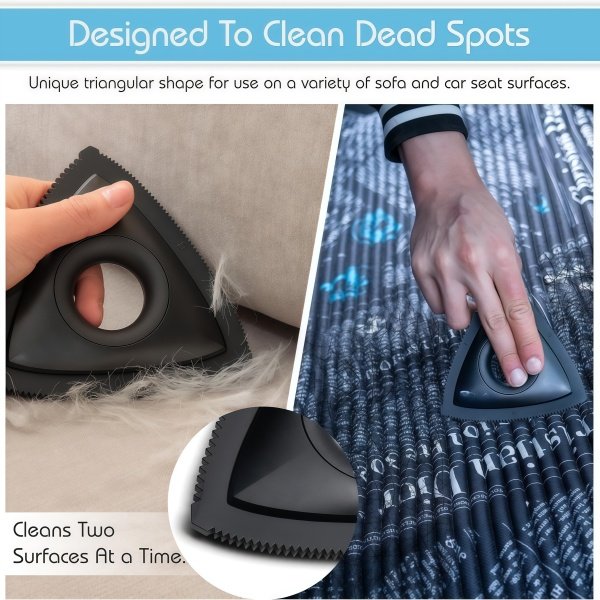 Pet hair remover features a triangular design that glides over surfaces to lift stubborn hair from car mats, furniture, beds, and clothes.