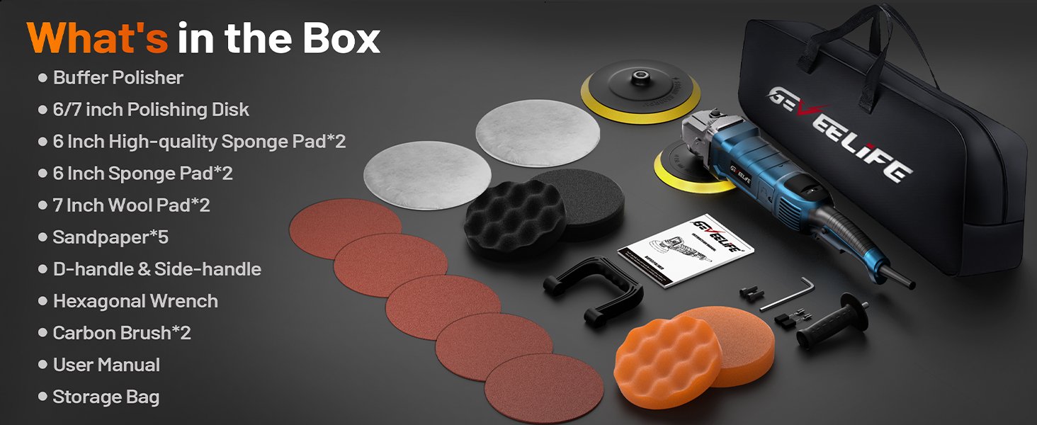 Buffer Polisher, 6/7 inch Polishing Disk, 6 Inch Premuim Sponge Pad*2, 6 Inch Sponge Pad*2, 7 Inch Wool Pad*2, Sandpaper*5, D-handle, Side-handle, Hexagonal Wrench, Carbon Brush*2, User Manual, Storage Bag |